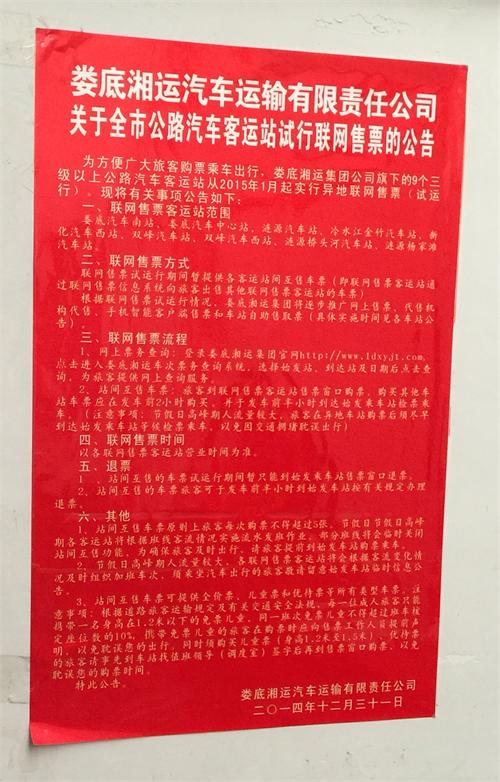 2015年春運將至,為方便市民購買回家車票,給廣大市民提供快捷、優(yōu)質(zhì)的出行服務,婁底湘運公司創(chuàng)新客運售票服務方式。從元月8日開始,公司轄下的婁底汽車站、婁底汽車南站、新化汽車西站、冷水江金竹車站、雙峰汽車站、雙峰汽車西站、漣源汽車站、漣源橋頭河汽車站、漣源楊家灘汽車站九個客運汽車站全面實行聯(lián)網(wǎng)售票,旅客可就近在其中任意車站購買其他車站始發(fā)車票!