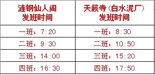7月5日:開(kāi)通漣鋼仙人閣至天籟寺、白水泥廠的專線班車(chē),每天四班,運(yùn)行線路及發(fā)班時(shí)間如下: