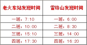 7月6日:開(kāi)通老火站至古塘、雷鋒山的農(nóng)村客運(yùn)班車(chē),每天四班,運(yùn)行線路及發(fā)班時(shí)間如下: