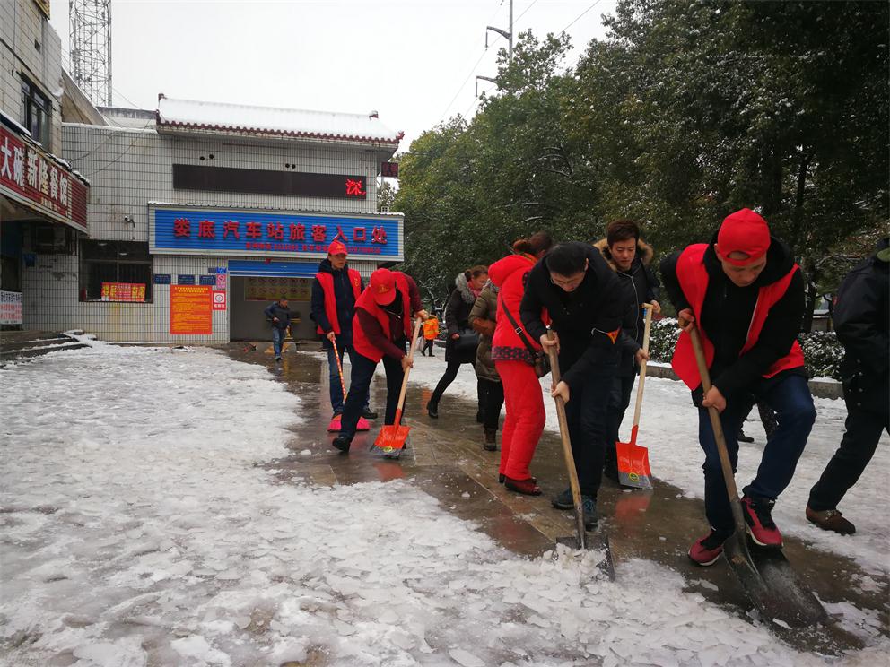 一場大雪像是為了迎接新年的到來,在2018年年末的午夜悄然而至,先是雪沙狂灑,爾后雪花不知疲倦的翩翩起舞,全城銀裝素裹,地上積雪高達80CM,潔白的雪花給人們帶來了喜悅的心情及瑞雪兆豐年的好兆頭,但也給公路出行帶來了不便。因積雪太厚,車站的客運班線車輛只能全線停運,但還是有些想出行的市民來車站詢問車輛運行情況和購買預(yù)售票。由于站場積雪、結(jié)冰現(xiàn)象嚴(yán)重,為防止旅客走路滑跌,同時及時做好班線復(fù)班準(zhǔn)備,婁客司經(jīng)理楊付生指示馬上啟動“破冰鏟雪”活動方案,由車站領(lǐng)導(dǎo)組織車站學(xué)雷鋒志愿者開展“鏟雪刨冰”活動。